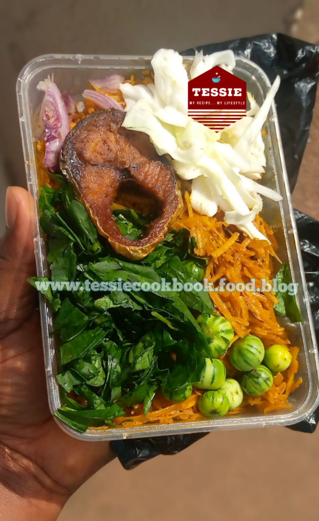 In a mixing bowl, pour into the drained abacha