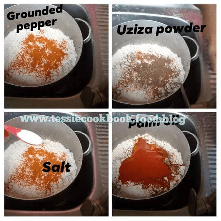 Put the powdered OKPA into a bowl, add all ingredients listed excluding warm water.